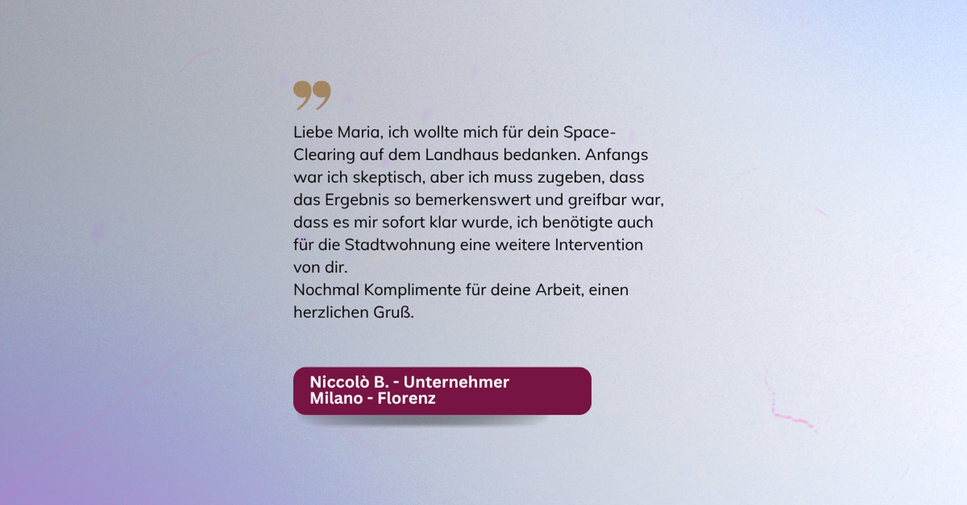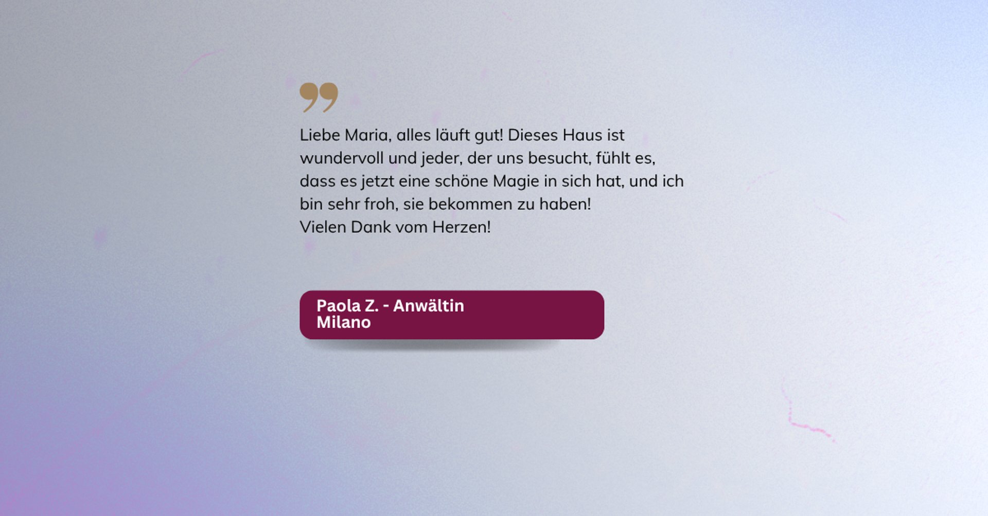Wir haben Harmonie, Gelassenheit, Wohlbefinden wiederhergestellt, alle Faktoren, die neue Lebensprojekte der Kunden ermöglicht haben.